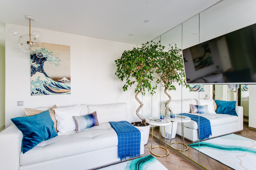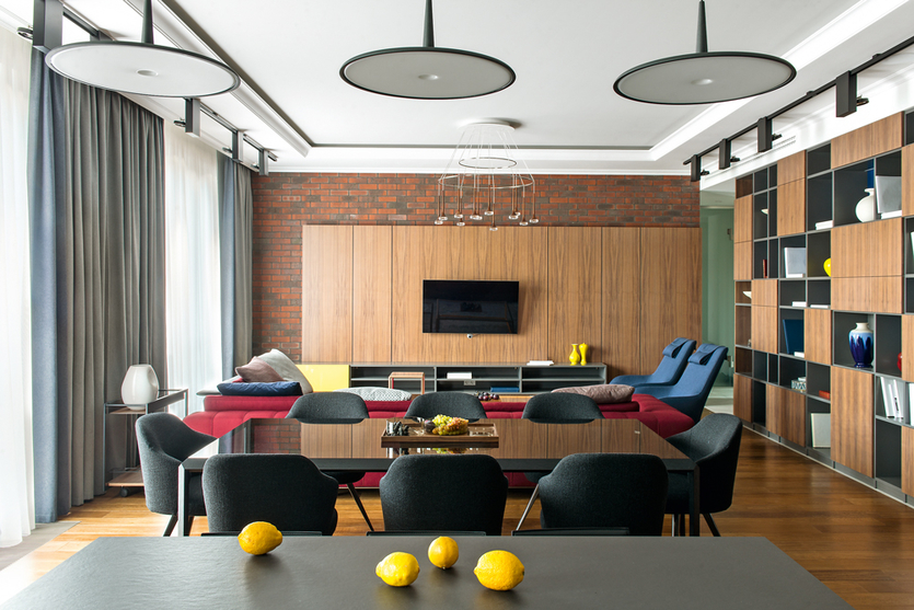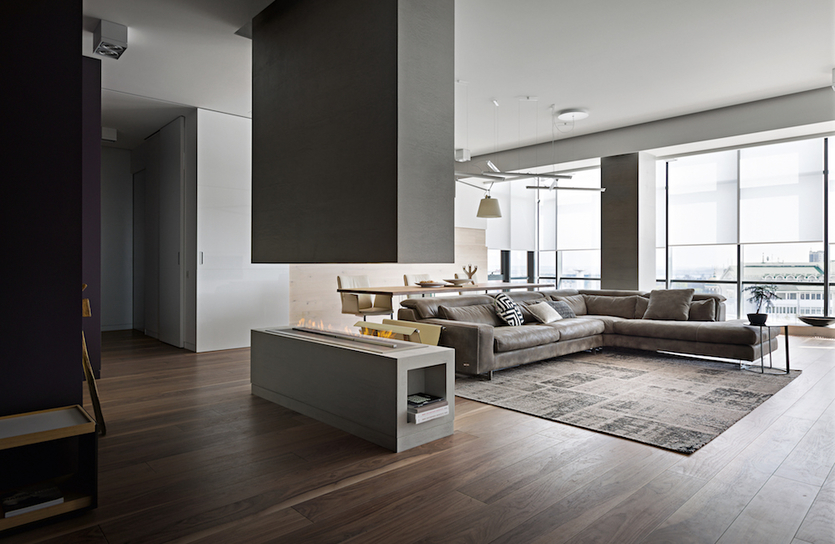 Залогом успеха этого проекта стало полное доверие и взаимопонимание между мной и заказчиками. Кстати сказать, это уже второй проект, который я сделала для этой замечательной молодой пары. В данном случае квартира расположена в монолитной высотке-новостройке. Если встать в угол, образованный пересечением двух панорамных окон, создаётся впечатление, что ты стоишь на самом краю крыши высокой многоэтажки