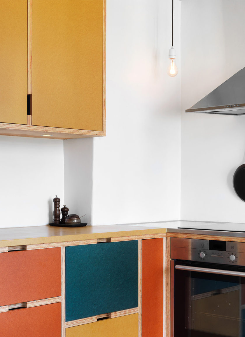 Бытовая техника (винный холодильник, духовой шкаф, микроволновая печь, кофемашина и т. д.) стала частью встроенной в кухонную нишу мебельной композиции с окрашенными филёнчатыми фасадами