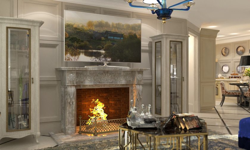 В облике интерьера происходит увлекательная встреча классических элементов (гипсовые розетки на потолке, накладной декор в отделке стен, детали предметов мебели и т. д.) с современным дизайном. Так, гостиную украшает классический камин из светлого мрамора, фланкированный двумя минималистичными, встроенными в ниши стеллажами с открытыми полками, на которых расположились библиотека заказчиков и памятные сувениры из поездок. Симбиоз стилей прослеживается и в дизайне тумбочки Amanda под телевизором, отделанной белым глянцевым лаком и украшенной резьбой ручной работы.