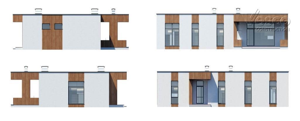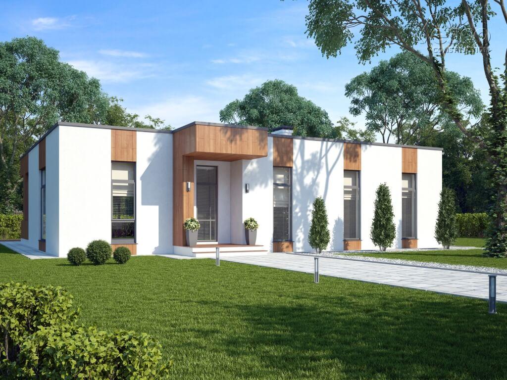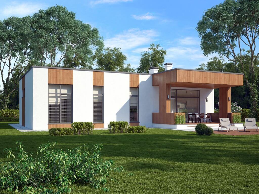 Этот дом довольно лёгок в реализации, так как отличается простотой и лаконичностью формы. Фасады светлые и графичные, дом выглядит компактным, а вертикали окон не только зрительно расширяют внутреннее пространство помещений, открывая вид на окружающий пейзаж, но и придают фасаду динамики. Конструкция, поддерживающая навес террасы, состоит из двух простенков, добавляющих фасаду ощущение устойчивости, также здесь скрыта труба печи барбекю, что добавляет фасаду единства. В отделке дома применены светлая штукатурка и плитка, имитирующая дерево тёплого оттенка, он смотрится сдержанно и в то же время оригинально, при этом сливается с окружением за счет небольшой высоты и плоской кровли. Этот коттедж станет для вас отличным решением, если вы цените функциональность и комфорт и мечтаете о загородном жилье!