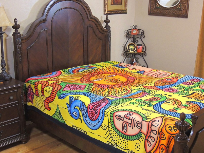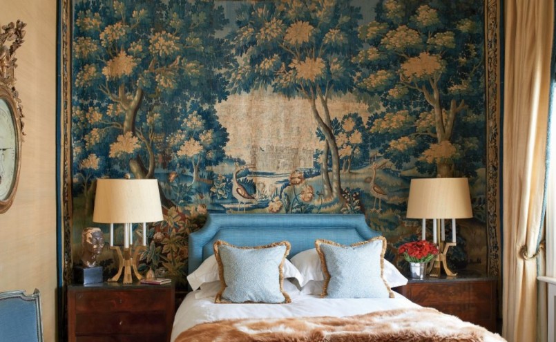 Спальня – место для экспериментов с фактурой гобелена. Тут можно применять как тонкие гобелены ручной работы, так и драпировки “грубой” работы, для обивки мебели. Многие люди любят мягкие, приглушенные тона для спальни, но имеются и исключения, желающие видеть у себя яркие краски в интерьере. Покрывала и подушки являются неотъемлемой частью любой спальни и должны быть сделаны в одном стиле.