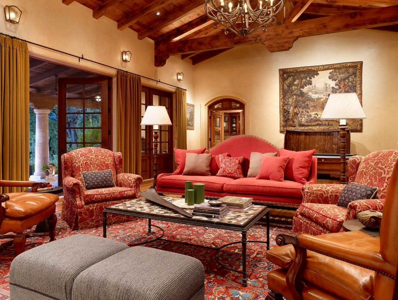 Большое пространство гостиной не нагружается мебелью, как остальные комнаты. Обычно тут ставят мягкую мебель и небольшие столики. Стены при этом остаются открытыми. Это пространство прекрасно подходит для различных произведений искусств, в том числе и крупного размера. Это могут быть копии старинных гобеленов или вытканные копии известных картин. Причем настенные панно оформляются массивными багетами.
