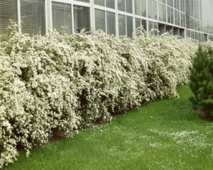 живая изгородь из кустов спиреи может быть создана из растений, высота которых более 80 см. Такое решение позволяет зонировать большой участок или отделить функциональные зоны парка.