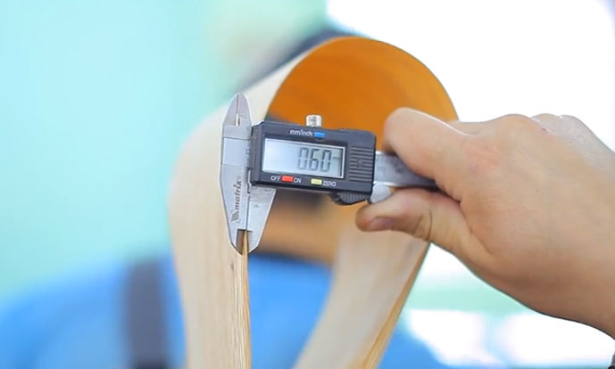 для определения толщины необходимо измерять в трех точках, равномерно находящихся по длине листа на расстоянии, как минимум, 25 мм от кромок, устройством, которое называется толщиномер. Длина и ширина шпона измеряется в середине ширины и длины листа при помощи металлической линейки или другого средства измерения.