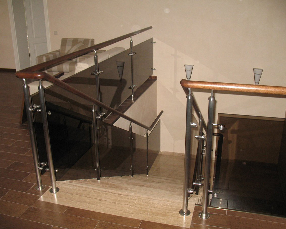 Несущие металлические конструкции выполняются из алюминия или нержавеющей стали с различной обработкой. Поверхность может быть полированной, глянцевой или матовой (достигается дополнительной шлифовкой). Сама сталь для подобных конструкций применяется разных сортов, в зависимости от места расположения ограждений. Новые технологии помогают активно использовать современные материалы для создания оригинальных и эффектных интерьеров. Мода на стекло пройдет не скоро, поскольку применение его дает возможность придать помещениям необычайно воздушный, светлый облик. При этом не теряется прочность и безопасность всей конструкции.