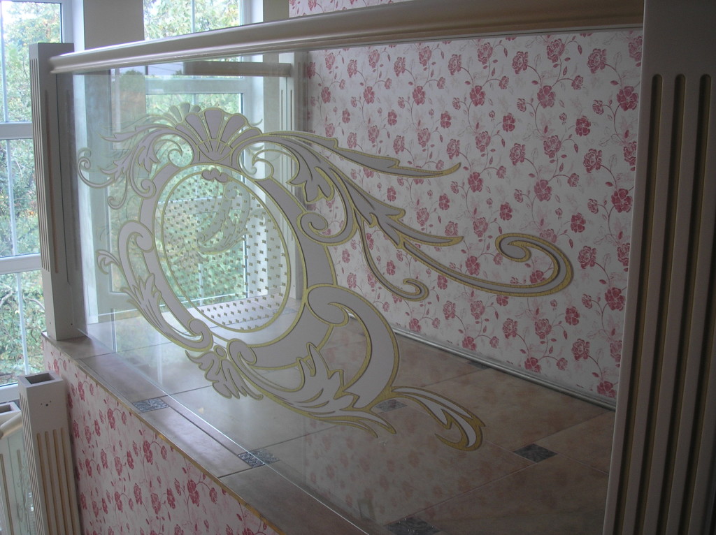 При установке на лестницу стеклянных ограждений открывается множество дизайнерских решений. На стекле можно разместить гравировку или самостоятельно выбранное изображение.