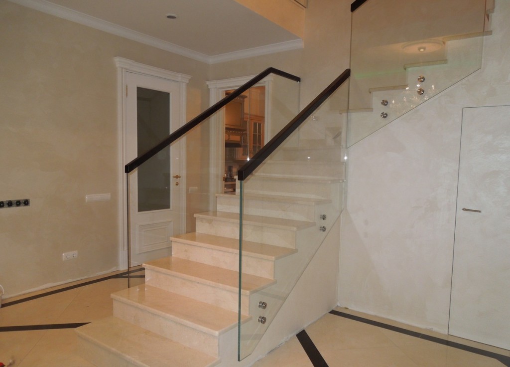 Ступени со стеклянными перилами крепятся несколькими способами: