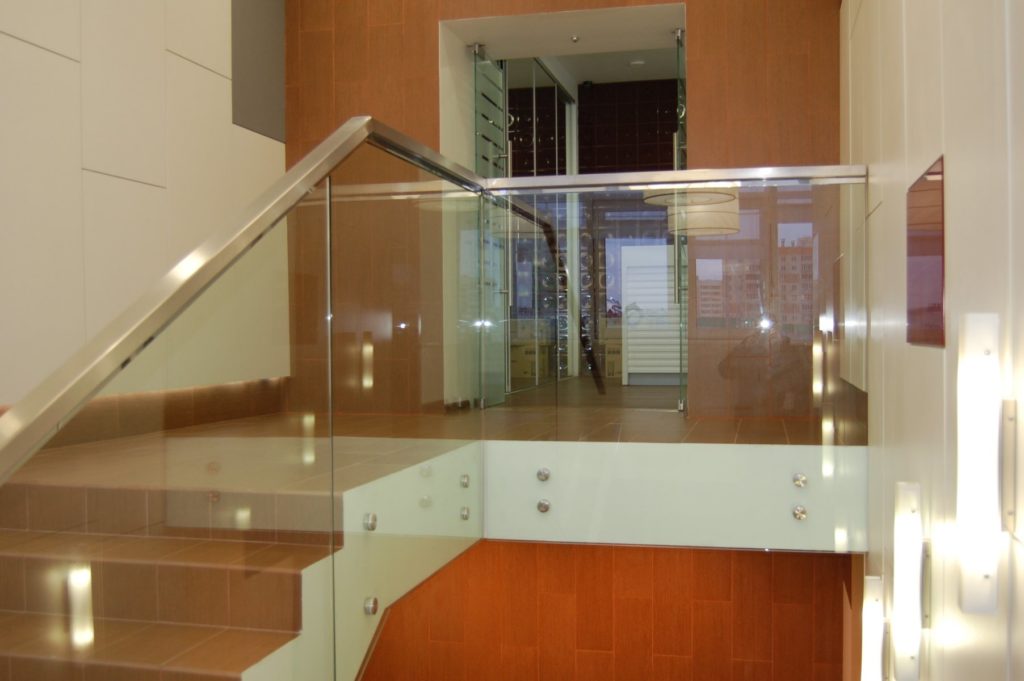 Применяются светопрозрачные конструкции для лестниц, как в торговых и офисных зданиях, так и в частных домах. Нередко используютс стеклянные констркции без перил. Выглядят они шикарно, однако степень безопасности использования у них ниже.