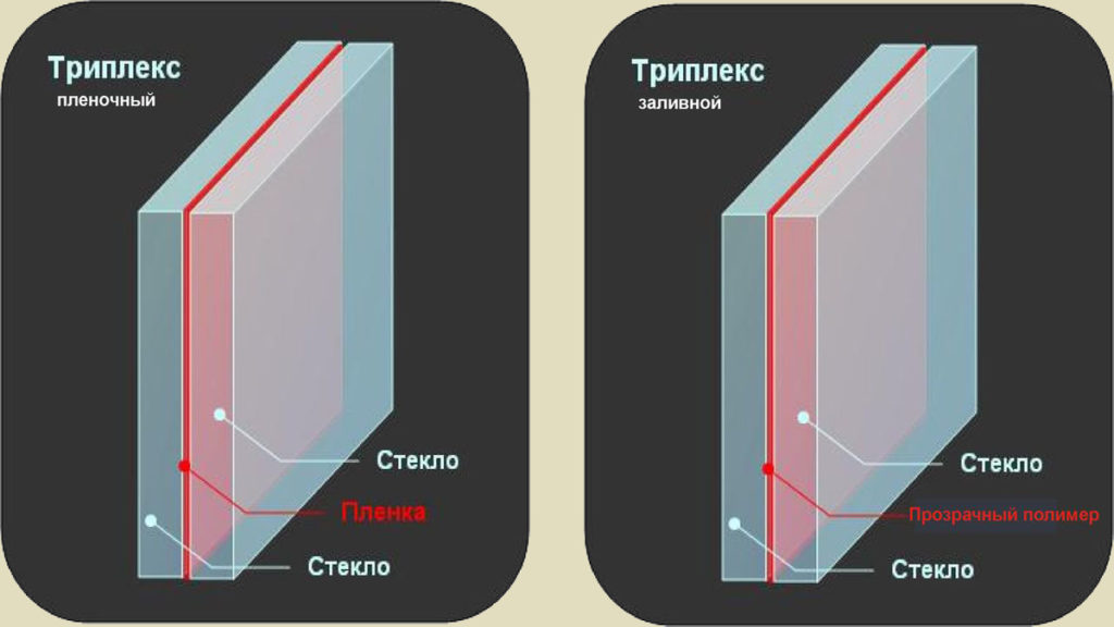 - заливным. Триплекс этого вида состоит из стеклянных полотен, которые соединяются между собой специальной жидкостью для склеивания;