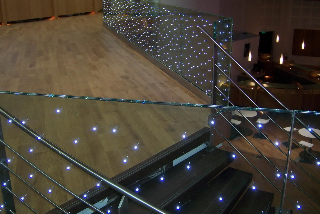 Перила из акрила позволяют использовать в качестве декора подсветку и тогда и без того красивые детали смотрятся гораздо ярче и необычнее. В некоторых случаях светодиодная подсветка используется не просто как декор, а как способ дополнительного освещения помещения.