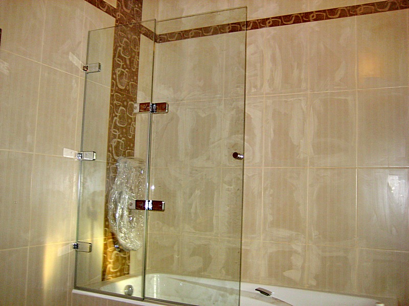 Осуществляется разметка под крепление на стенах, краях ванной и на полу. В отмеченных точках просверливают отверстия, в них устанавливаются приобретенные держатели. Если крепежи вмонтированы надежно, то на них водружаются стеклянные листы, после чего их сцепляют друг с другом.