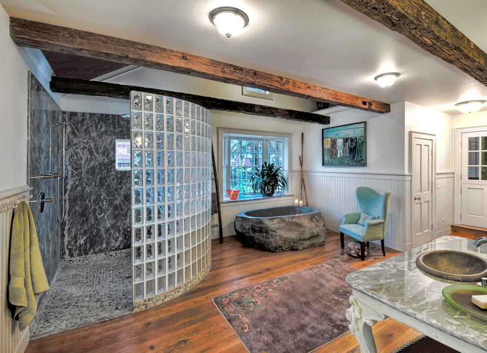 Если необходимо разделить помещение ванной на несколько изолированных секторов, но при этом сохранить ощущение свободного пространства, и создать необычный интерьер, то возможно использовать перегородки из стеклоблоков в ванной. Их форма бывает прямой либо изогнутой в зависимости от желания заказчика и параметров ванной, в которой они будут устанавливаться. Возводить прямые перегородки проще, чем полукруглые. Для создания поворотных конструкций используют угловые элементы.