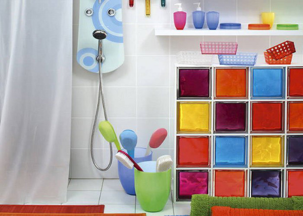 Перегородки любой формы собираются из стеклянных кирпичиков, которые могут быть разных цветов. Наибольшую популярность имеют бесцветные стеклоблоки, так как они пропускают максимум цвета, к тому же самые недорогие. Они подойдут к любому интерьеру, и при смене дизайна стен перегородку можно не менять.