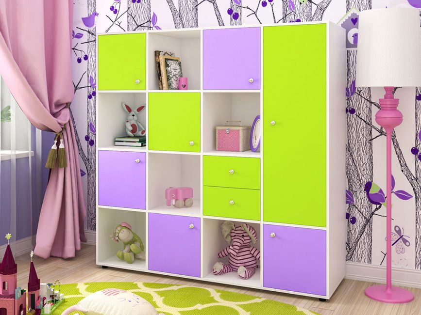 - Многофункциональность. Визуально стеллажи напоминают серванты, которые в недалеком прошлом можно было встретить в каждой квартире советского человека. В них отсутствуют дверки, а значит, ребенок может беспрепятственно достать любимую игрушку или книгу.