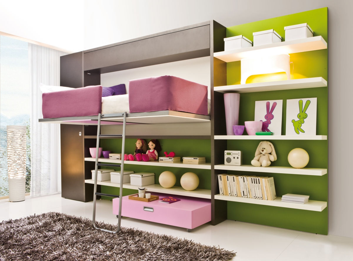 - с кроватью. Внизу стеллажа находятся открытые полки и выдвижные ящики для хранения детских игрушек и постельных принадлежностей, а сверху – кровать. Такое решение органично впишется в небольшую по площади комнату;