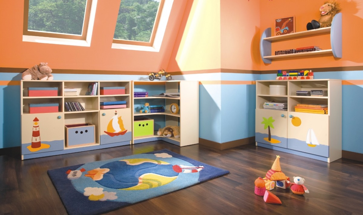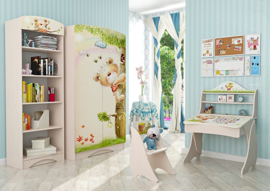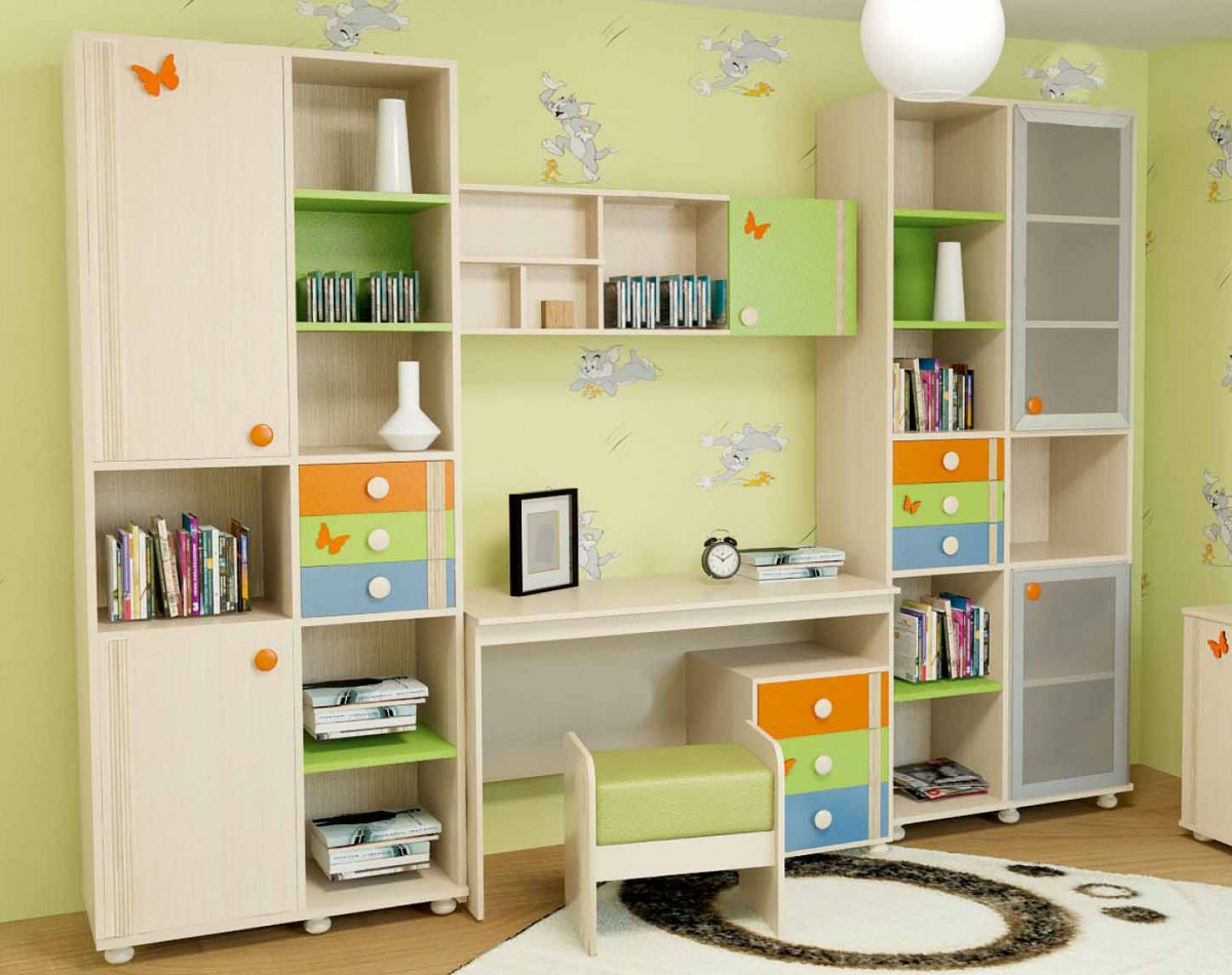цветовое решение. Для детской лучше всего подойдет мебель с различными яркими акцентами. Это поможет придать комнате красок, а также правильно организовать систему хранения. Полки могут быть окрашены в разные цвета, на ручках – изображения животных.