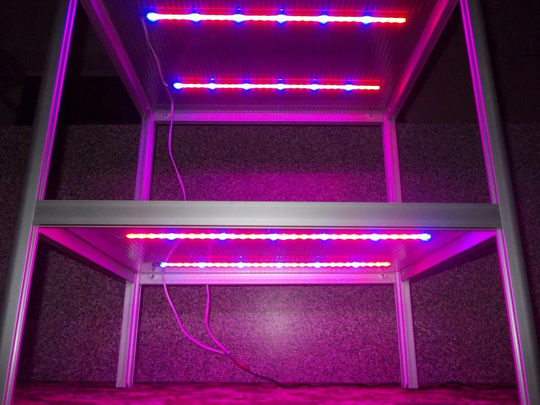 Лучшие спектры светового излучения – это красный и синий, причем красный помогает растениям прибавлять в росте, а синий помогает клеткам развиваться.