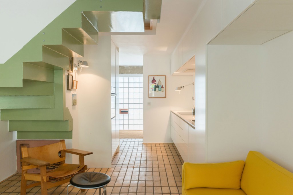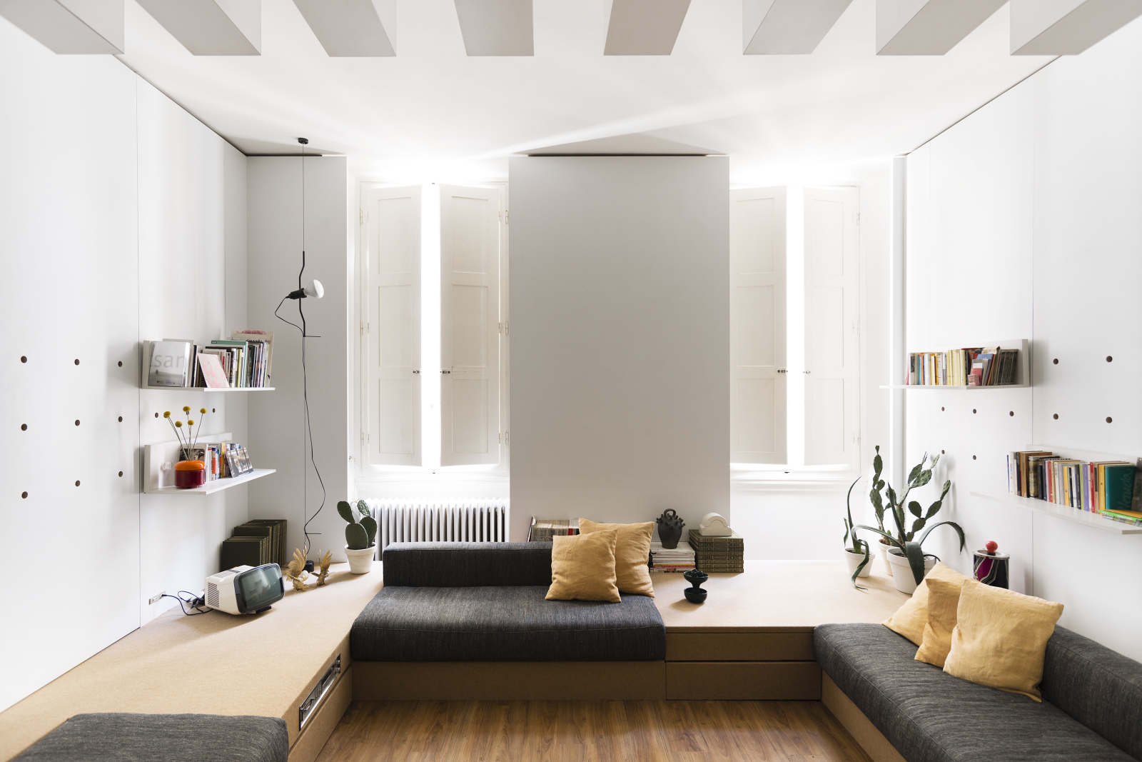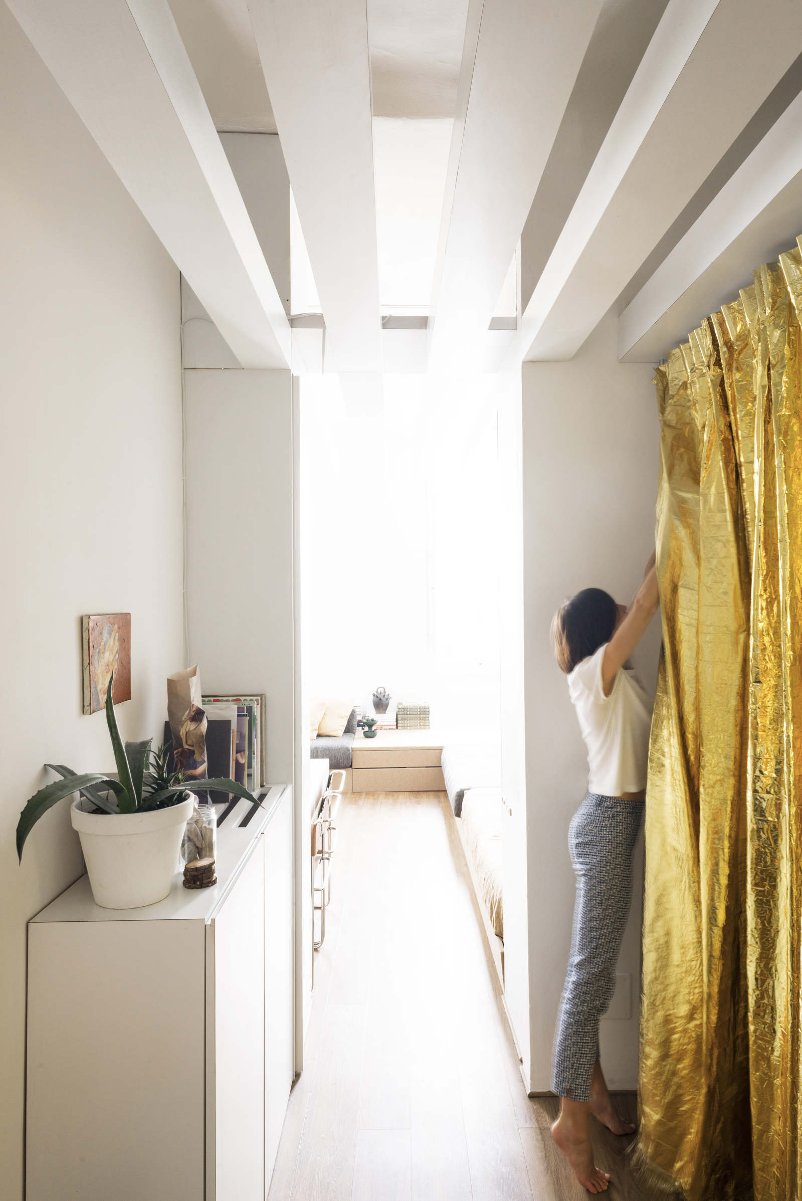 Молодая архитектор Сильвия Аллори обосновалась в квартире во Флоренции, которая одновременно стала для нее и рабочим местом. Площадь объекта — 42 кв.м. Девушка подошла к организации маленького пространства, следуя трендам: она создала гибкие интерьеры. Аллори убрала мебель за белые панели из ламината, кухню спрятала за золотой ширмой. Чтобы визуально расширить пространство, архитектор использовала только белый цвет. Разбавили идеально чистые стены точечные светильники, а потолок — подвешенные горизонтальные «колбы». В результате получился минималистичный проект, в котором удобно и работать, и отдыхать.