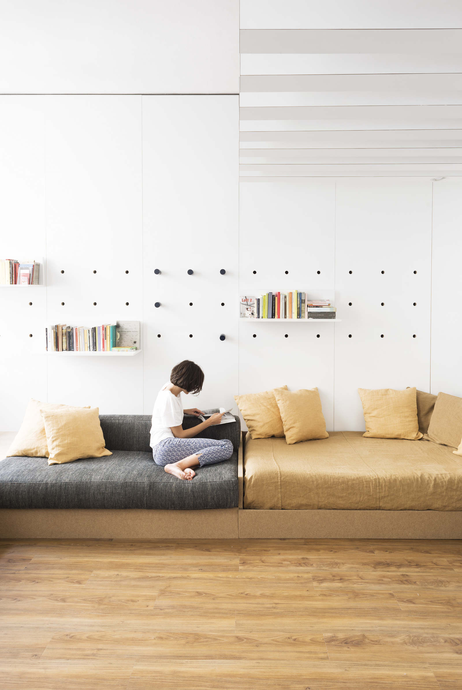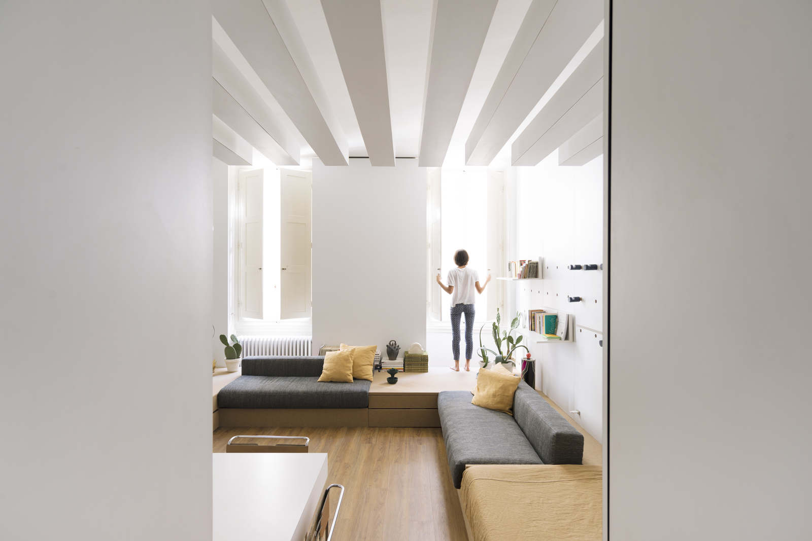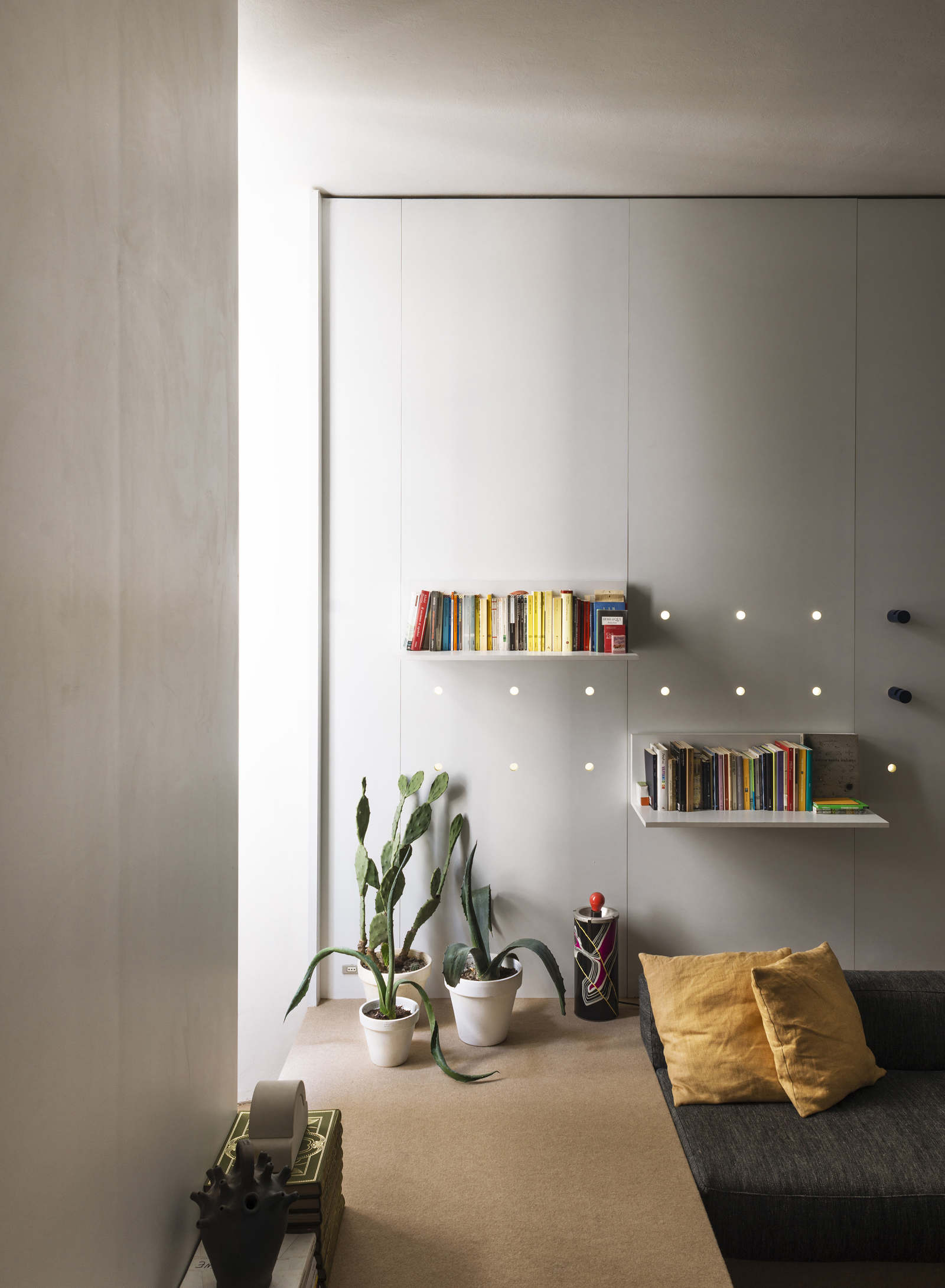 Молодая архитектор Сильвия Аллори обосновалась в квартире во Флоренции, которая одновременно стала для нее и рабочим местом. Площадь объекта — 42 кв.м. Девушка подошла к организации маленького пространства, следуя трендам: она создала гибкие интерьеры. Аллори убрала мебель за белые панели из ламината, кухню спрятала за золотой ширмой. Чтобы визуально расширить пространство, архитектор использовала только белый цвет. Разбавили идеально чистые стены точечные светильники, а потолок — подвешенные горизонтальные «колбы». В результате получился минималистичный проект, в котором удобно и работать, и отдыхать.