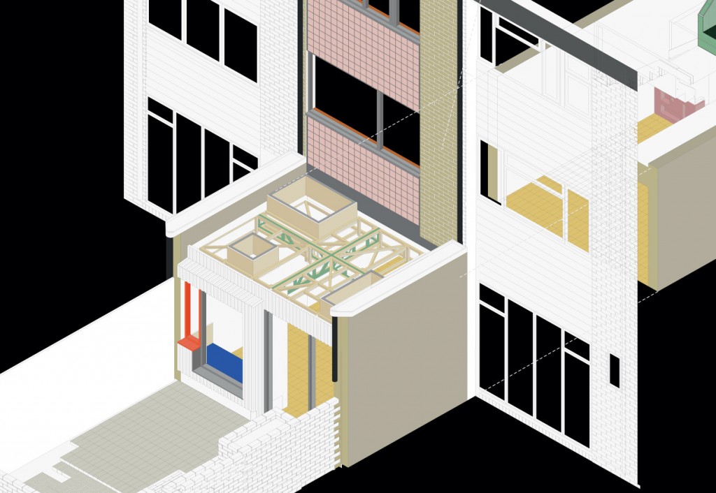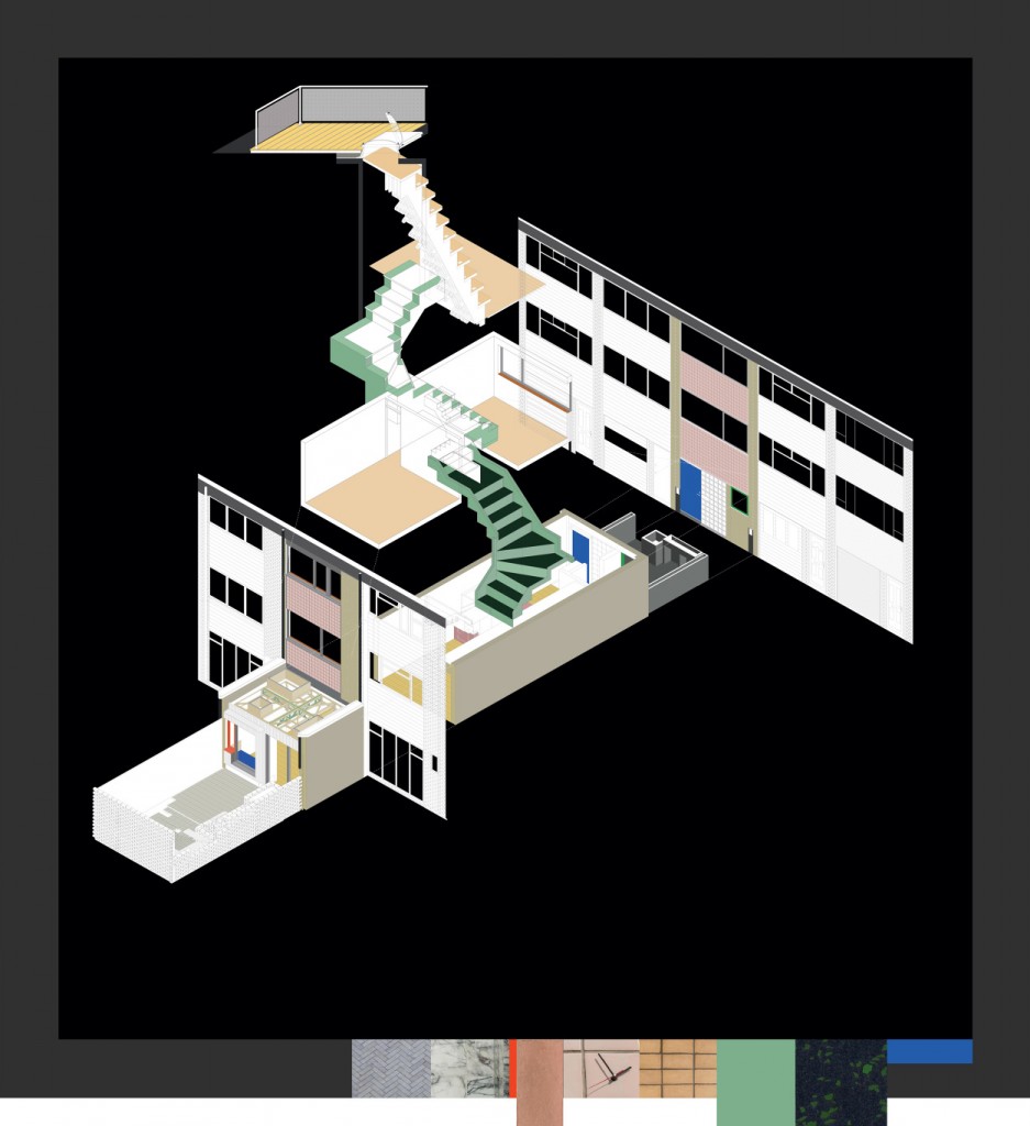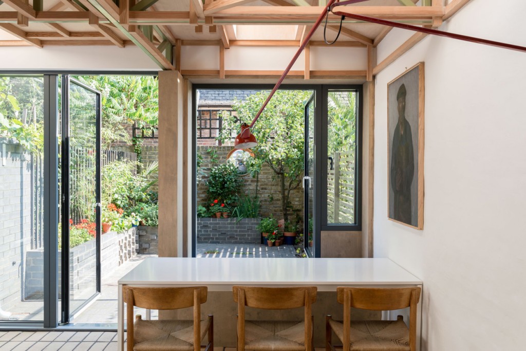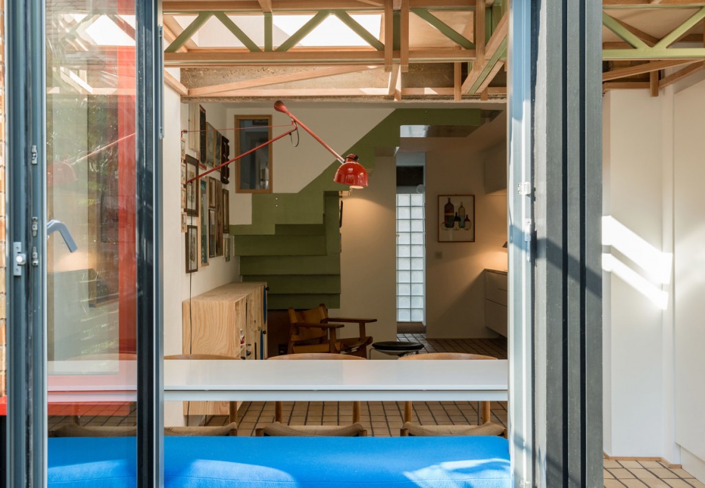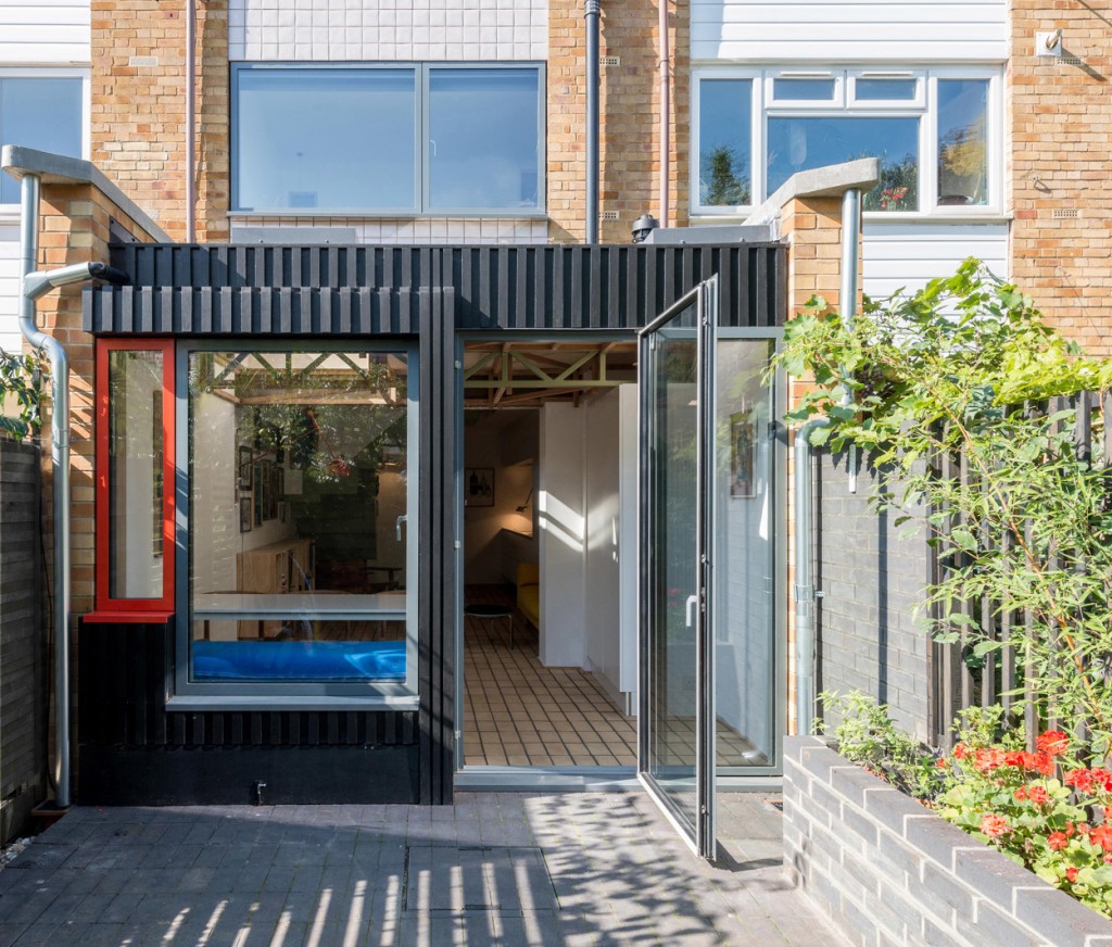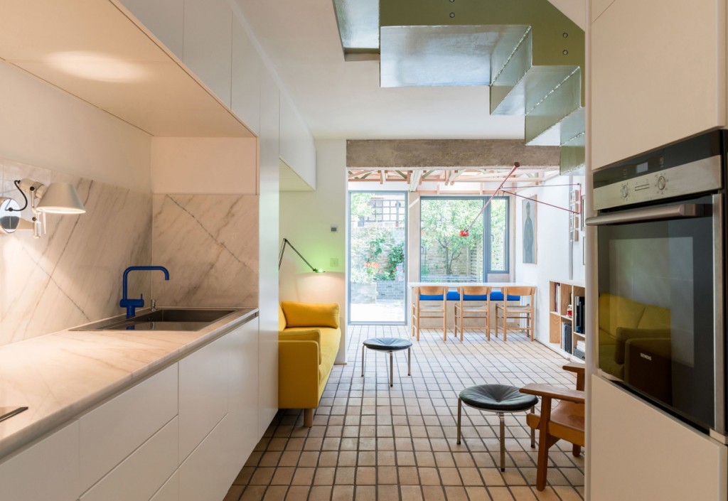 Основатели бюро Archmongers, Маргарет Бурса и Джохан Хибшмен, живут в реконструированном доме 1960-х годов, который стоит среди викторианских особняков в старой части Лондона. Архитекторы решили использовать как можно больше материалов, которые смогли бы отразить дух города: это и плитка, и стекло, и фанера, и бетон. Например, их можно встретить в лондонском метро и пабах. Материалы долгоживущие и эффектно выглядят, поэтому они вписались в проект. Символом какофонии материалов стала лестница, которая ведет на крышу: ее ступеньки собраны из более чем 100 элементов — например, в лестнице частицы березового дюбеля. Сами архитекторы называют проект «головоломкой материалов».