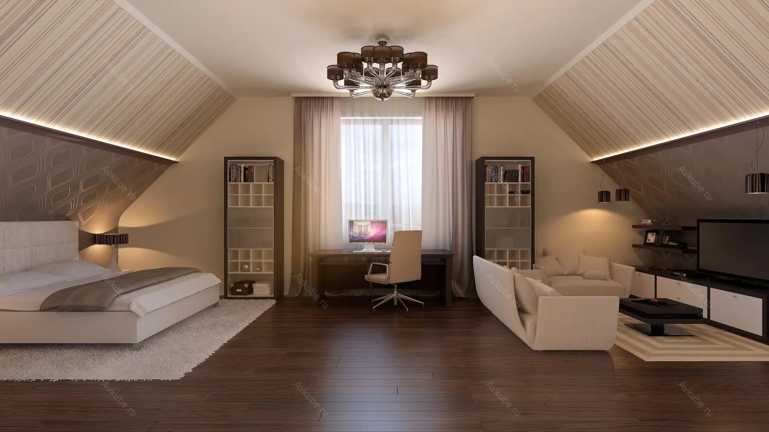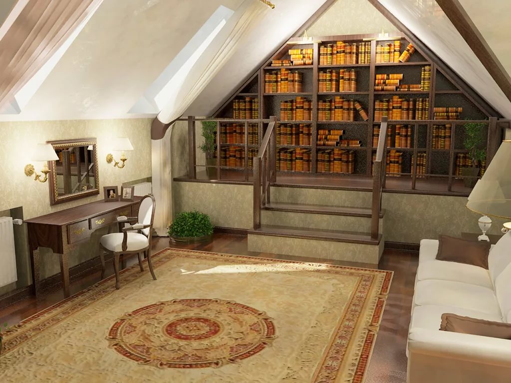 мансарда или второй этаж обычно отводятся под интимную территорию владельцев. Тут могут располагаться спальни, детская, библиотека, рабочий кабинет.