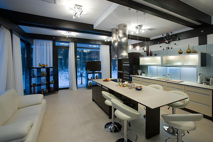- на нижнем этаже располагаются такие помещения, как кухня и хозблок, санузел и котельная, столовая и гостиная. Дополнительно здесь же размещаются комнаты для гостей;