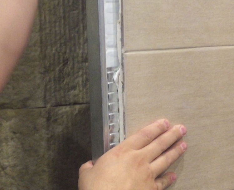 В нашем случае с одной стороны повезло так как стык между плиткой попал точно по центру металлопрофиля. Нам надо приклеить металлопрофиль только в трех местах.