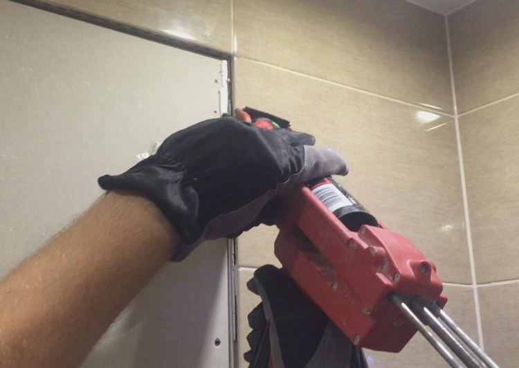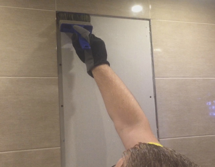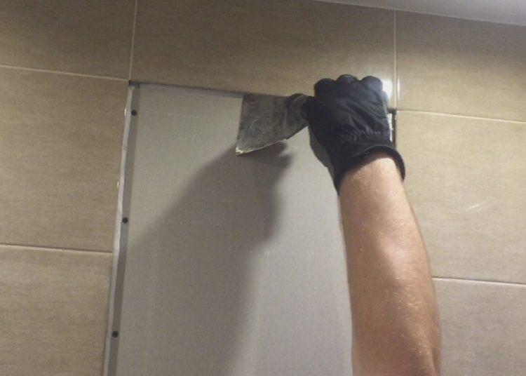 Плитка приклеивается не хитрым способом, наносим клей зубчатым шпателем с глубиной паза 6 мм по всей площади гипсокартона. Далее просто вклеиваем целые плитки выдерживая расстояния для швов с помощью крестиков для плитки. После того как плитка высохнет снимаем крестики и затираем швы затиркой для швов Ceresit CE 40 Aquastatic.