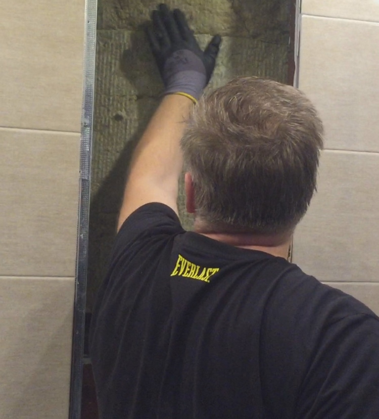 Для того что бы уменьшить шум от труб укладываем каменную вату Isover на 100 мм.
