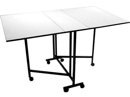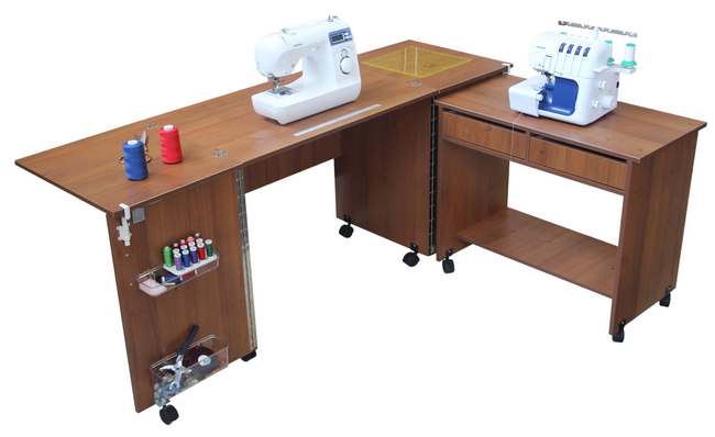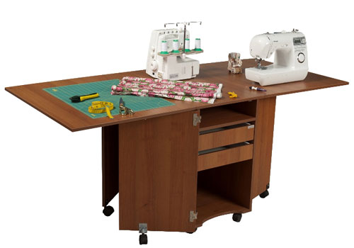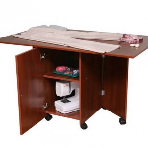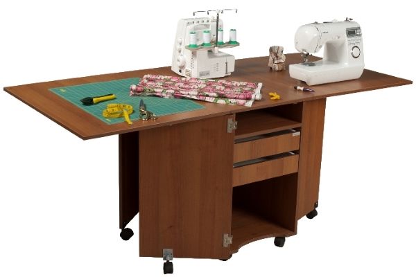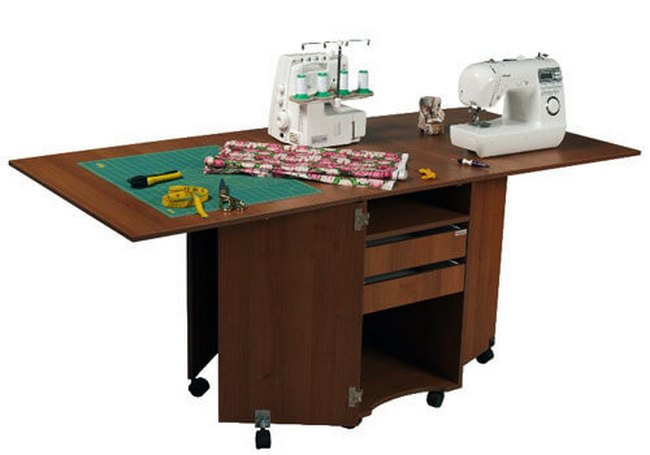 В основном любительницы домашней кройки и шитья останавливают свое внимание на специальных, складывающихся столах-трансформерах. Благодаря наличию множества отсеков, полочек и ящичков в сложенном виде это изделие способно вместить в себя весь инвентарь, необходимых для портняжного процесса – начиная от электрической швейной машины и заканчивая такими вечно теряющимися мелочами как нитки, наперстки и иголки