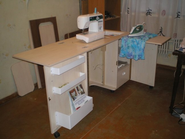 Даже для швейной машинки при складывании такого стола нашлось место. Она просто туда опускается вместе с площадкой, укрепленной на специальных полозьях.
