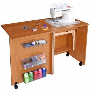 Для бытовых швейных машин в магазине можно купить уже готовый, складной столик. Описывать его преимущества нет смысла. Это хорошо видно на фото. Все, что у вас есть для швейного процесса можно вместить в этот стол, начиная от ниток и заканчивая оверлоком. Если есть возможность, то лучше варианта для обустройства вашего швейного места не придумать.