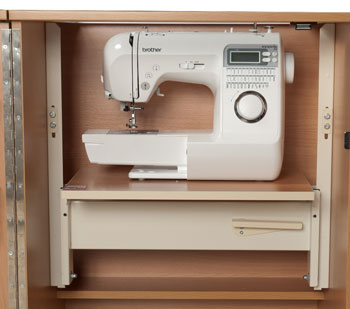 Внутри тумба наделена специальным отсеком для установки машинки, а также множеством полок для инструментов, выкроек и материала. Различную мелочь можно положить в кармашки, расположенные на дверцах.