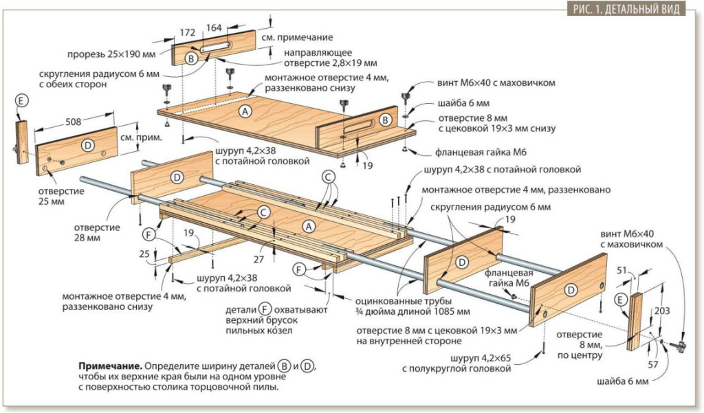 5. Выпилите откидные упоры Е и просверлите в них 8-миллиметровые отверстия (рис. 1).
