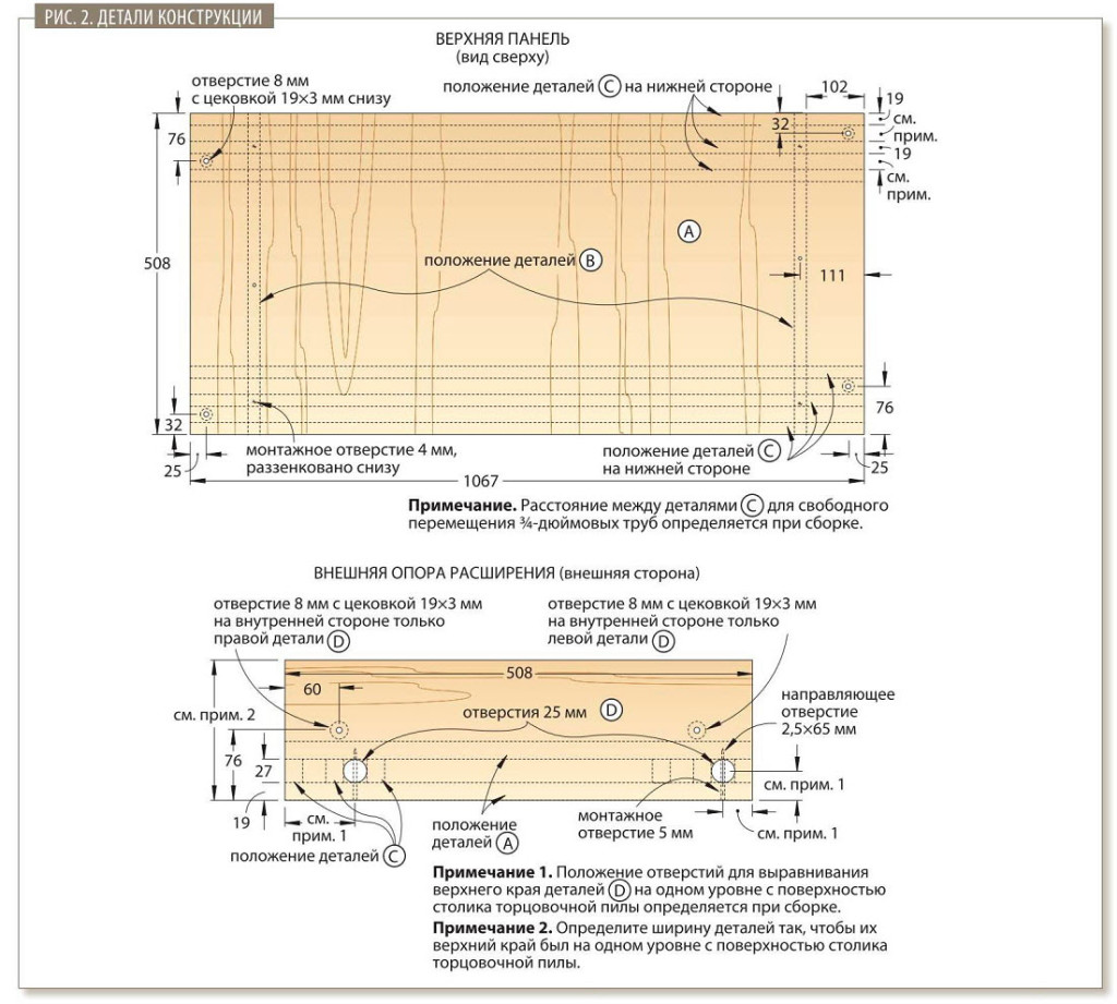 1. Для опор расширений D выпилите четыре заготовки размерами 152 x 508 мм. Чтобы определить их окончательную ширину, поставьте торцовочную пилу на верхнюю панель А. Положите длинное правило из прямой доски на столик пилы и ручки-опоры В, чтобы его концы выходили за края платформы. Измерьте расстояние от правила до нижней стороны нижней панели. Опилите заготовки опор D до этой ширины и сохраните обрезки.