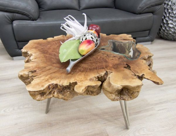- Поперечные срезы на ножках с естественным контуром. Это могут быть маленькие журнальные столики или составная композиция. Настоящая удача – найти спил толстой секвойи или дуба, тогда можно сделать стол для большой обеденной зоны.