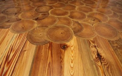 Обкладка модульного пола. Сложная в исполнении технология. Чтобы избежать формирования пустот для выкладки выбирают окружности толстых срезов. Ввиду усиленной эксплуатационной нагрузки задействуют лишь твердые породы деревьев. |