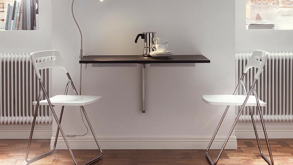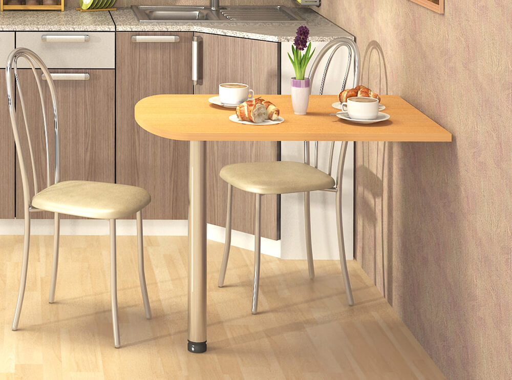 Подвесной кухонный стол вообще лишён ножек. Он надёжно фиксируется к стеновой поверхности с помощью кронштейнов.