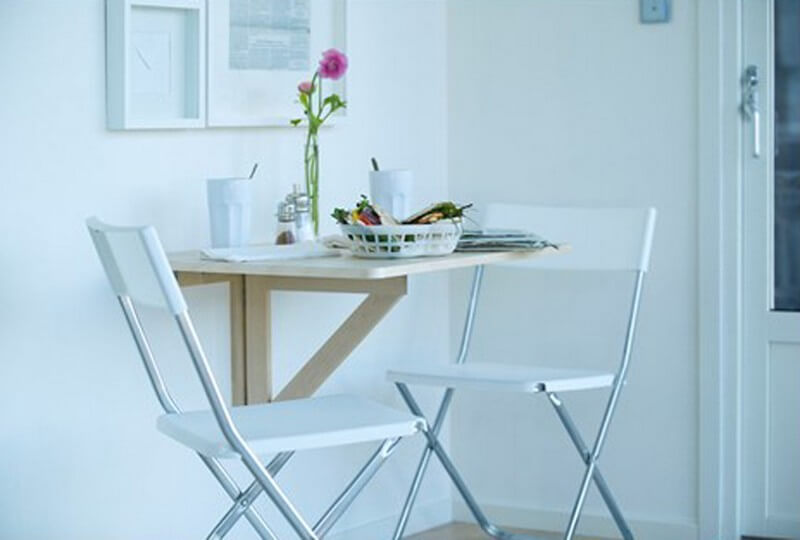 Наиболее компактной считается изделие с откидной столешницей. Её принцип раскладывания напоминает книгу. В нерабочем состоянии большая часть располагается в вертикальном положении. Для фиксации подъёмной детали устанавливают приставные или выдвижные ножки.