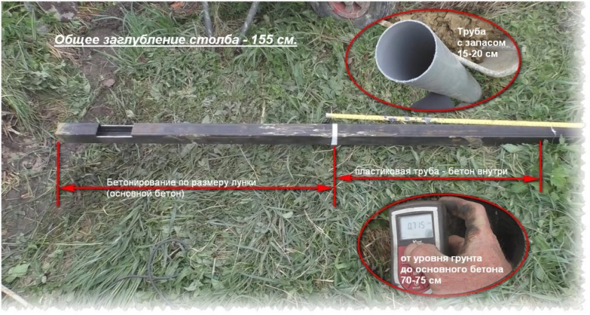- тип местности. В классическом варианте 1/3 трубы уходит в землю, 2/3 остаются на поверхности. На песчаных, сыпучих почвах добавляют 10 – 15 см к нижней части для устойчивой фиксации. Рекомендована следующая формула: высота забора + глубина промерзания + 20 см;