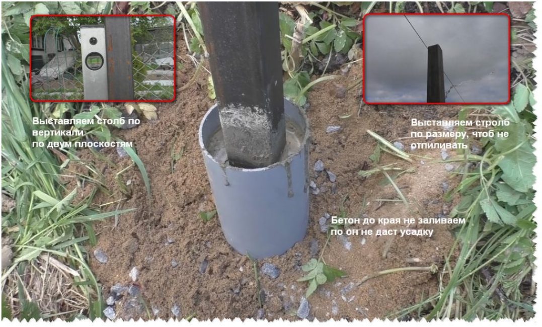 При значительных нагрузках на стабильных почвах осуществляют полное бетонирование. В подготовленную скважину насыпают «подушку» из песка, щебня, устанавливают металлический столб. Оставшееся пространство цементируют, контролируя вертикаль.