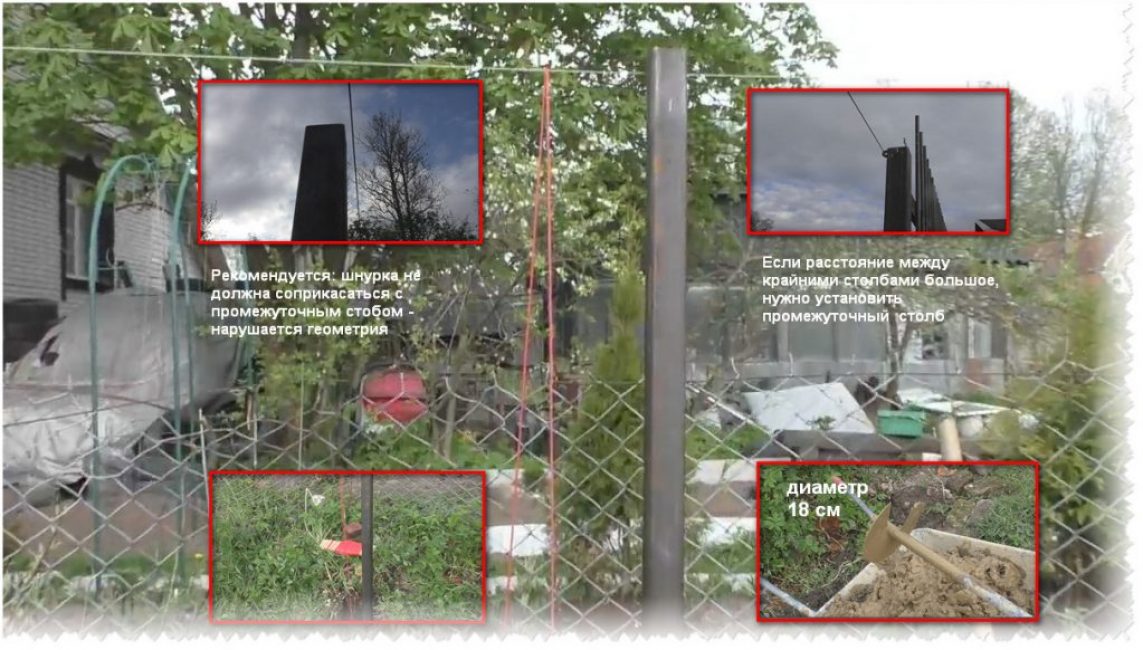 Для этого необходимо правильно натянуть металлическую проволоку или верёвку (ещё говорят, струну или шнурку), расположив её не в нижней, а в верхней части столбов. Натяжение нужно делать от одной угловой точки до другой, располагая концы на уже установленных столбах. Для большего удобства и контроля можно натянуть струну сразу вверху и внизу. Но этого можно не делать, потому что каждый столб всё равно проверяется по уровню, а место его расположения точно определяется с помощью отвеса.