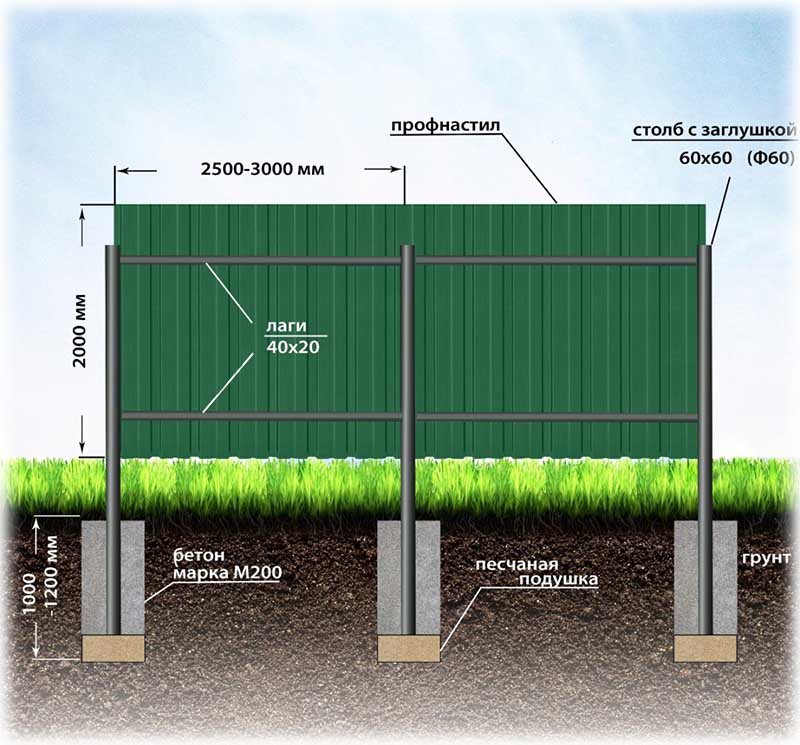 - при высоте забора 2—2,5 м принимайте сечение профильной трубы 60 х 40 мм, на полутораметровую изгородь пойдут изделия размером 40 х 40 мм;