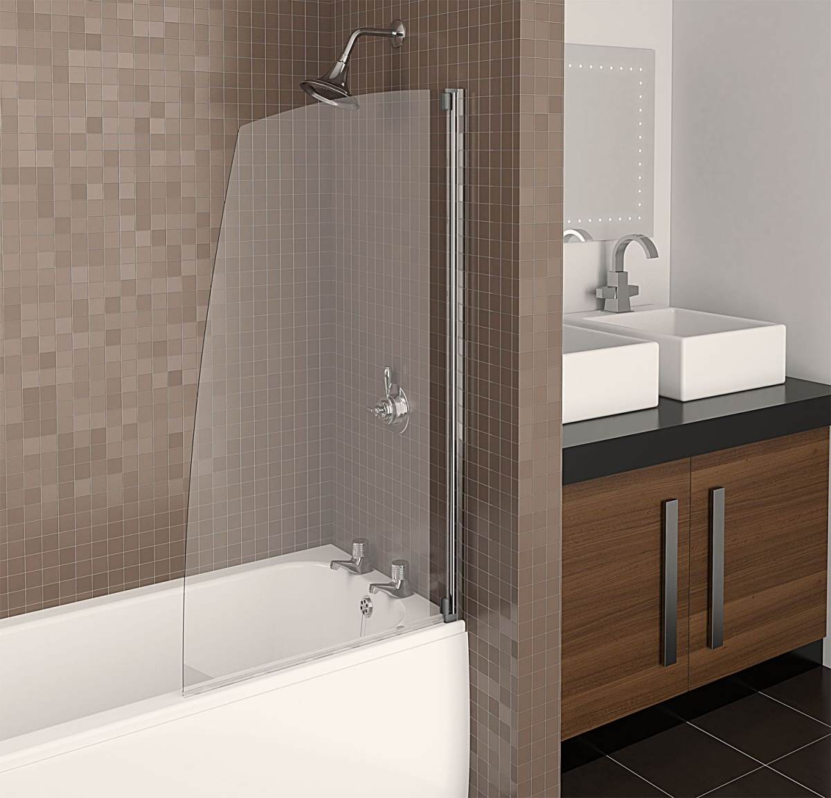 Воспользоваться вариантом «ширма-экран» можно в помещении, где мало свободного пространства, и стеклянной перегородкой отделяют лишь часть пространства. Чаще всего используются для декора в ванных комнатах с совмещенным санузлом. Перед монтажом нужно определиться с местом установки всей конструкции, такая модель – ширма может совмещаться с умывальником одним смесителем. Естественно, лучше выбирать такую модель для свободных помещений с большим пространством, так как прозрачная стенка не будет визуально увеличивать комнату. Минусом такой модели не будет полностью закрытое пространство при принятии душа, брызги могут быть по всей ванной.