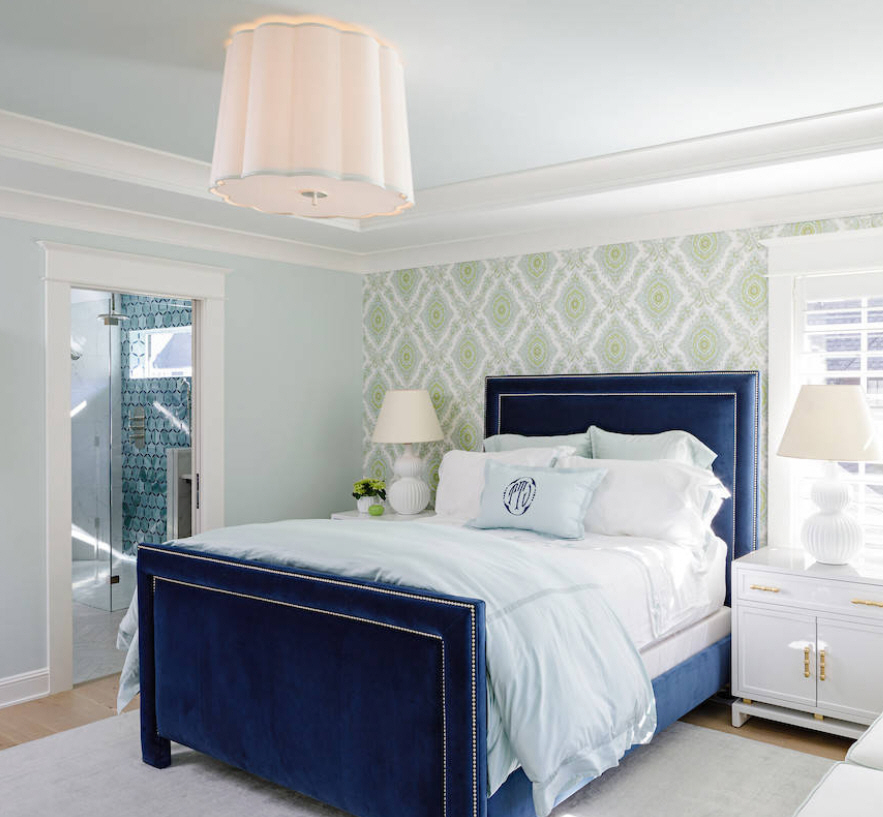 Попробуйте повесить в спальне портьеры, где на бледном голубом фоне размещены насыщенно-синие узоры. Или наоборот, синие завесы с рисунками, вышитыми медовыми или золотистыми нитями. Просматривается что-то королевское.