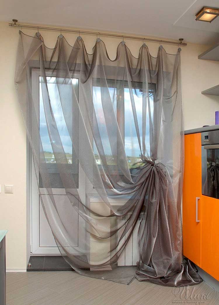Прозрачные шторы с декоративными подхватами для кухни с балконной дверью