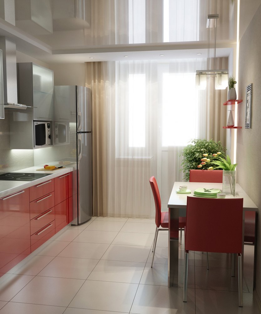 Лёгкие гардины в интерьере кухни с балконной дверью