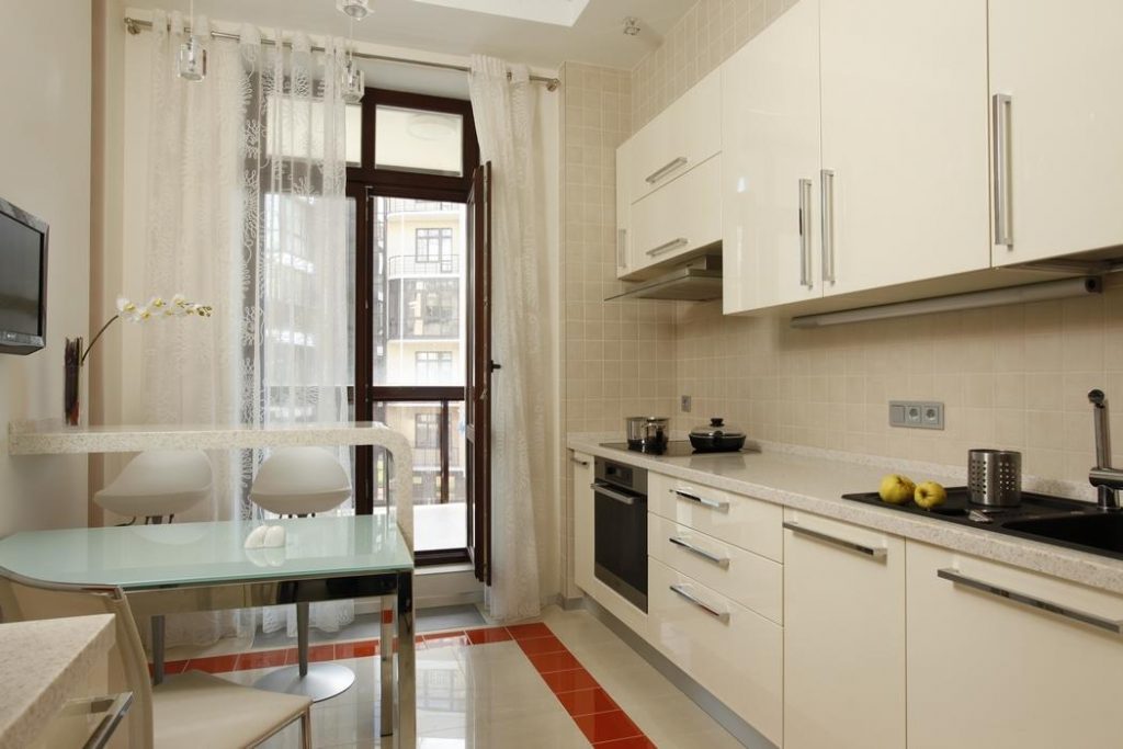 Только после этого необходимо приступать к подбору цветовой палитры занавесок, которая будет гармонично смотреться и не будет визуально разделять балконную дверь и кухонное пространство.