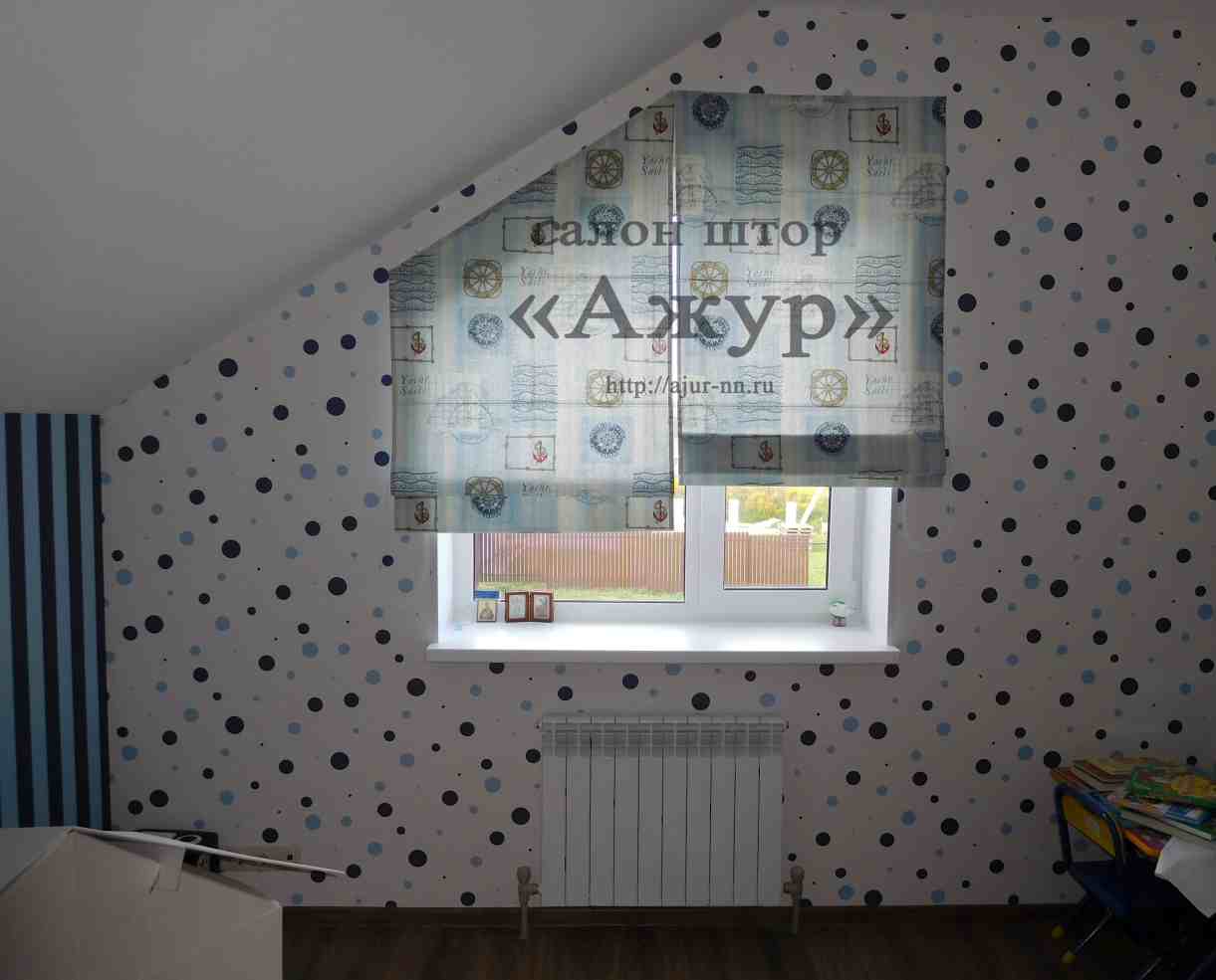 Римские шторы на скошенные и треугольные окна. Подъемные шторы могут быть прямыми, если есть возможность установить карниз параллельно полу. Или можно сшить скошенную римскую штору. Для этого подъемный механизм ставится параллельно линии потолка или окна. Нужно учитывать, что полностью штору открыть не получится. Косые римские шторы хорошо подходят в кабинет, или в качестве ночных плотных штор.