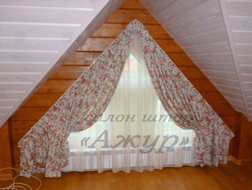 Возможно, мы немного расстроим любителей бюджетных вариантов – чтобы дешево и сердито. В случае с такими нестандартными оконными проемами этот вариант практически исключен. Потому как в готовом виде приобрести занавеси на треугольные окна невозможно: обязательно нужно учитывать конкретные параметры этих самых окон.